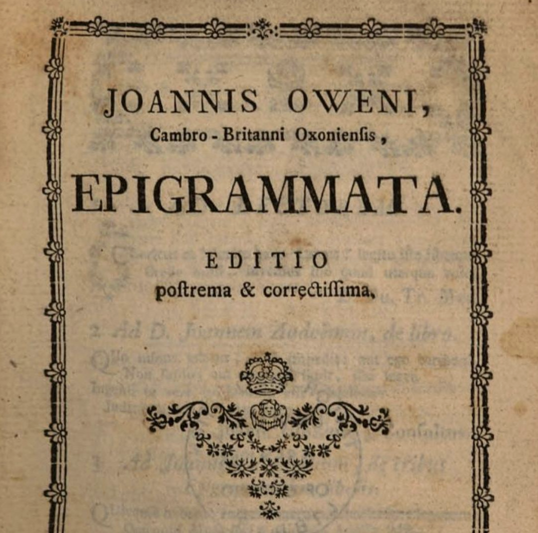 Self-deprecating, often-funny, notably short, and generally quite simple to read, the Latin epigrams of Welsh poet John Owen (born c. 1564) are suited indeed to the needs of students interested in Neo-Latin poetry.