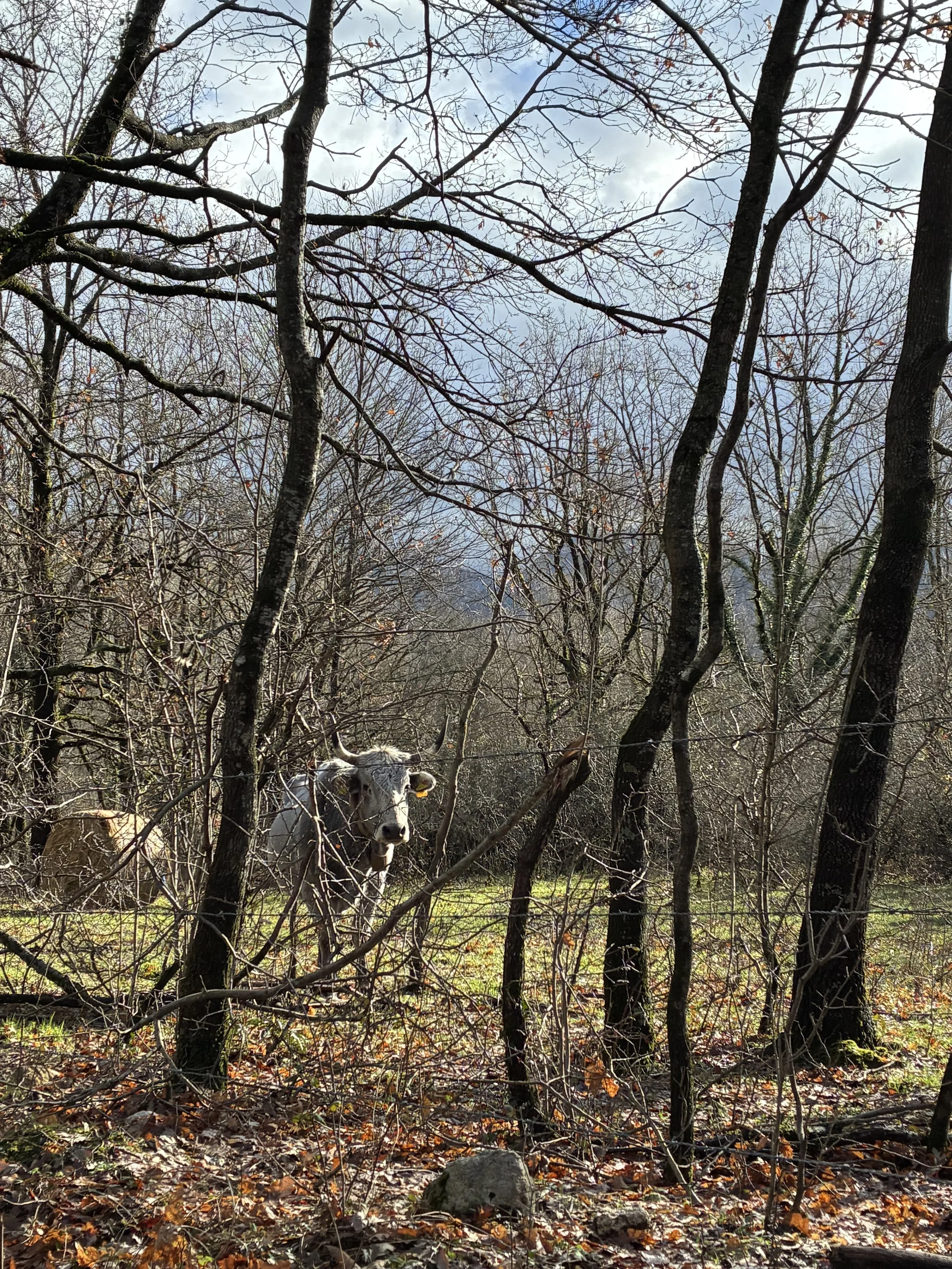 Of course, in terms of personality, I don’t find cows as compelling as other animals, like donkeys. When I was very small, in America, I had a “friend” who was a donkey. I liked her much more than the chickens who were rather disagreeable and the goats who were prone to chewing on my sleeves. I’ve only ever seen one donkey in Montella, bursting out of the forest and running down a paved road at ten in the evening after our footsteps startled him. I would not keep a cow myself, because I am lazy, enjoy traveling, and wouldn’t know where to put her, but I enjoy watching them in Montella and hearing the funny bells while walking in the woods. The bells are nice because you know, generally, where the cows are and whether they are about to run you over.